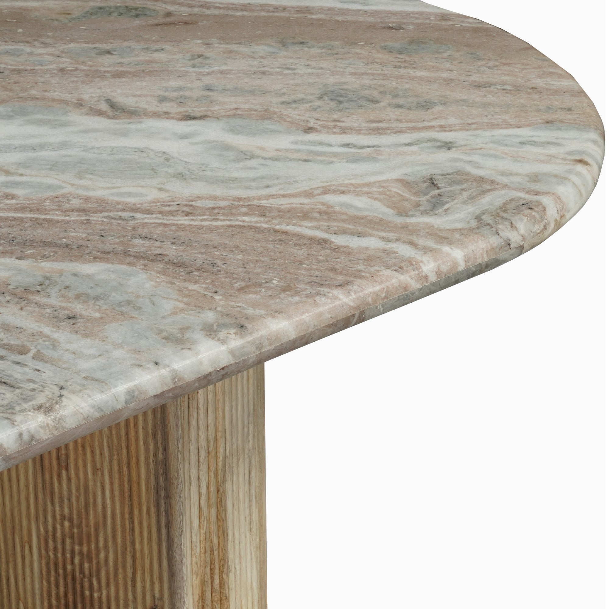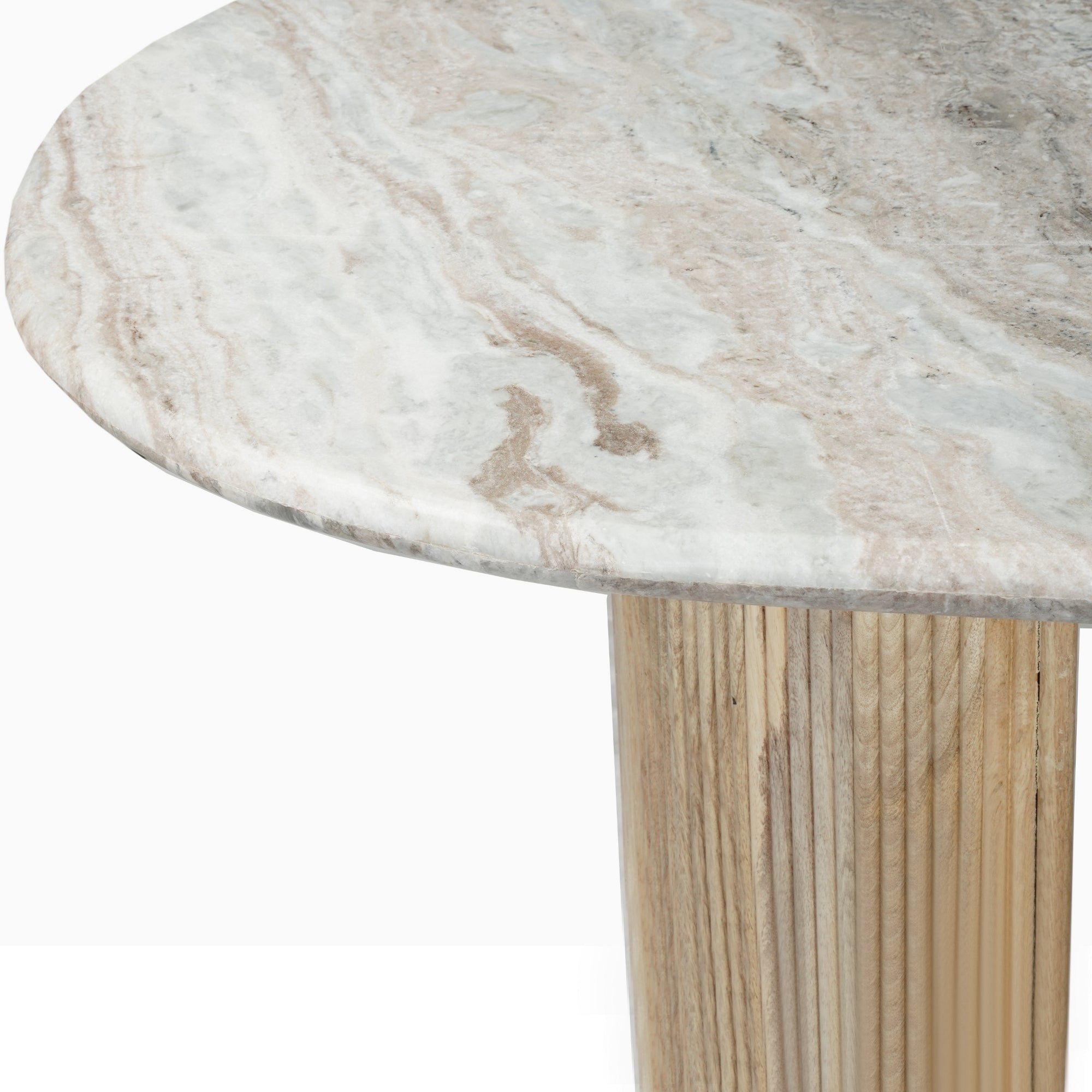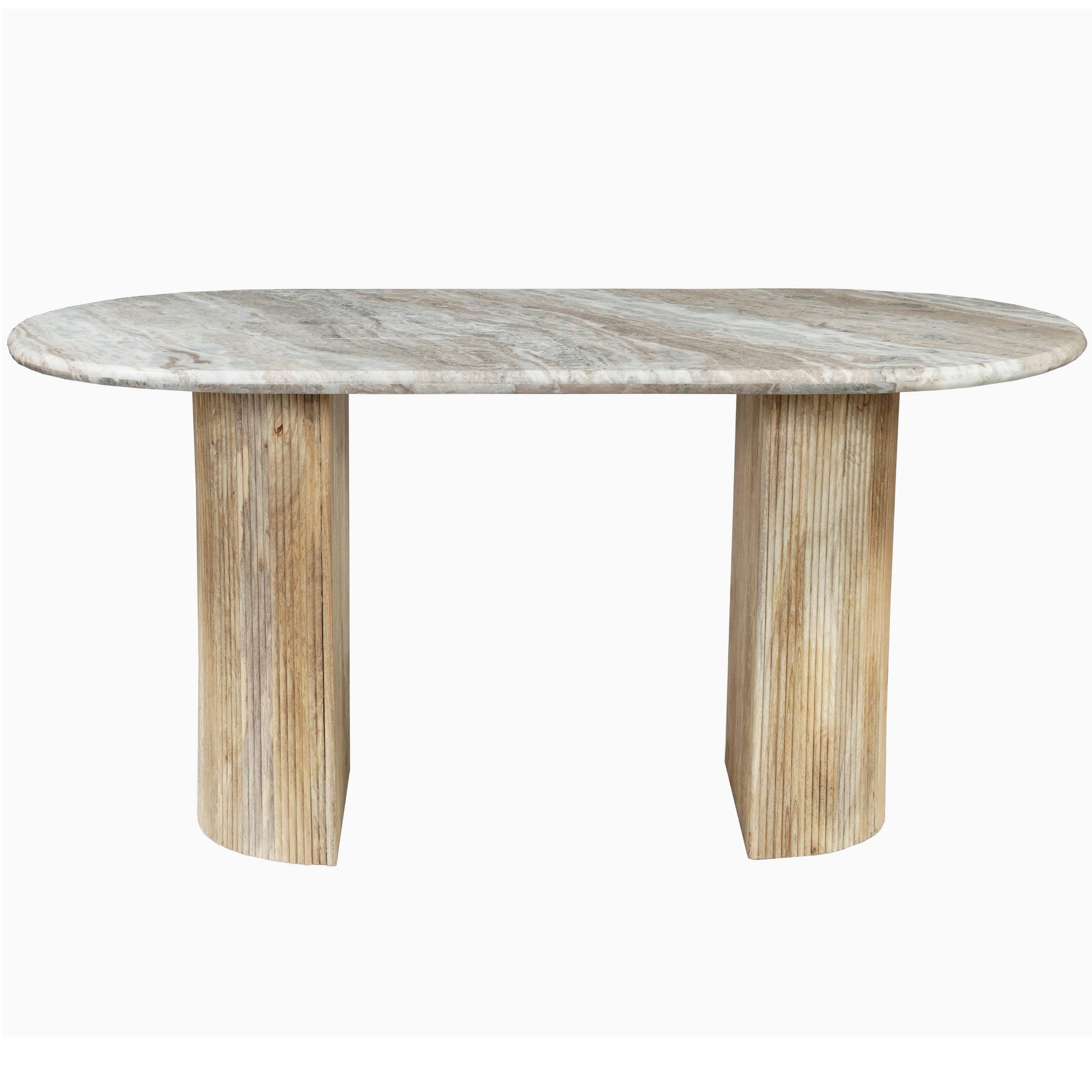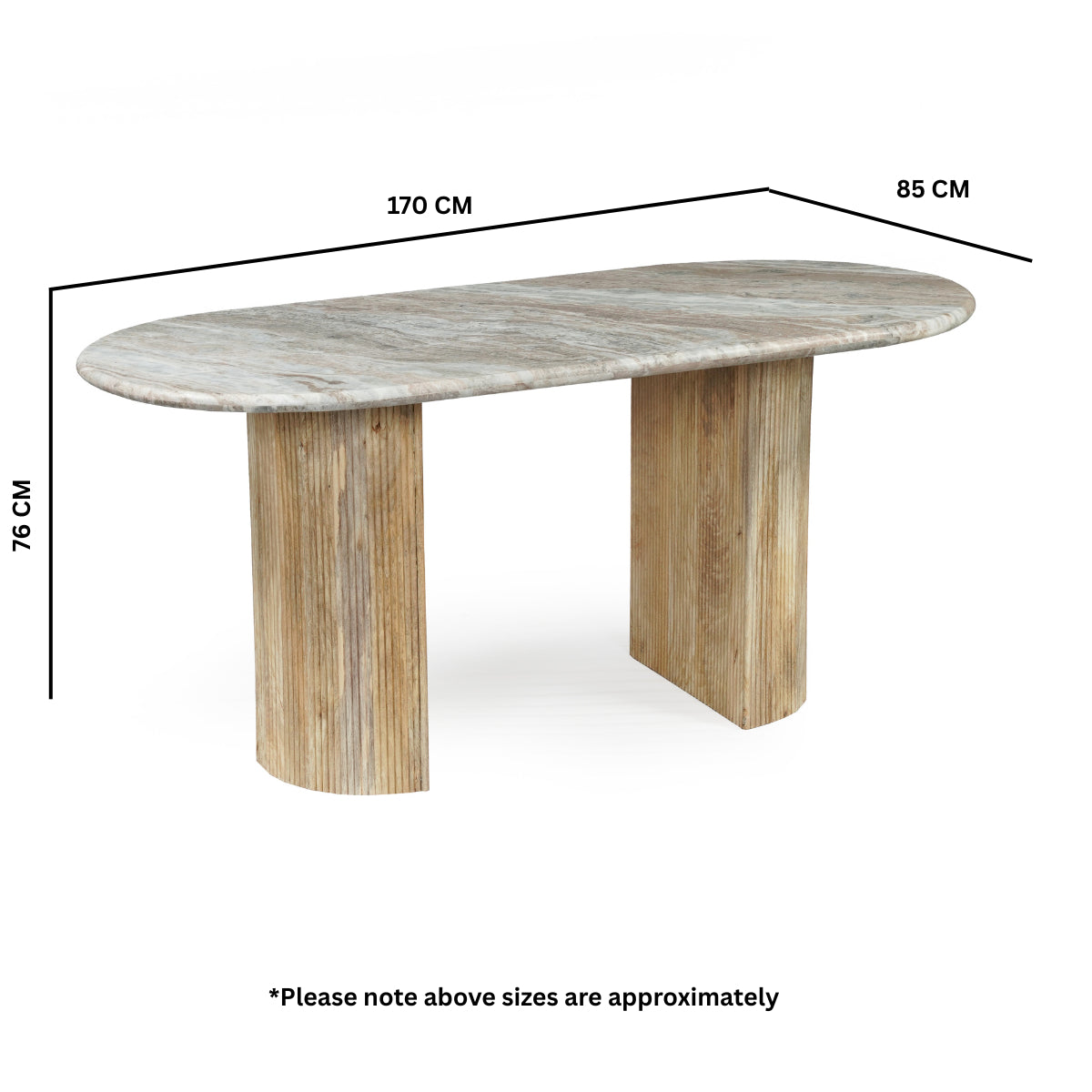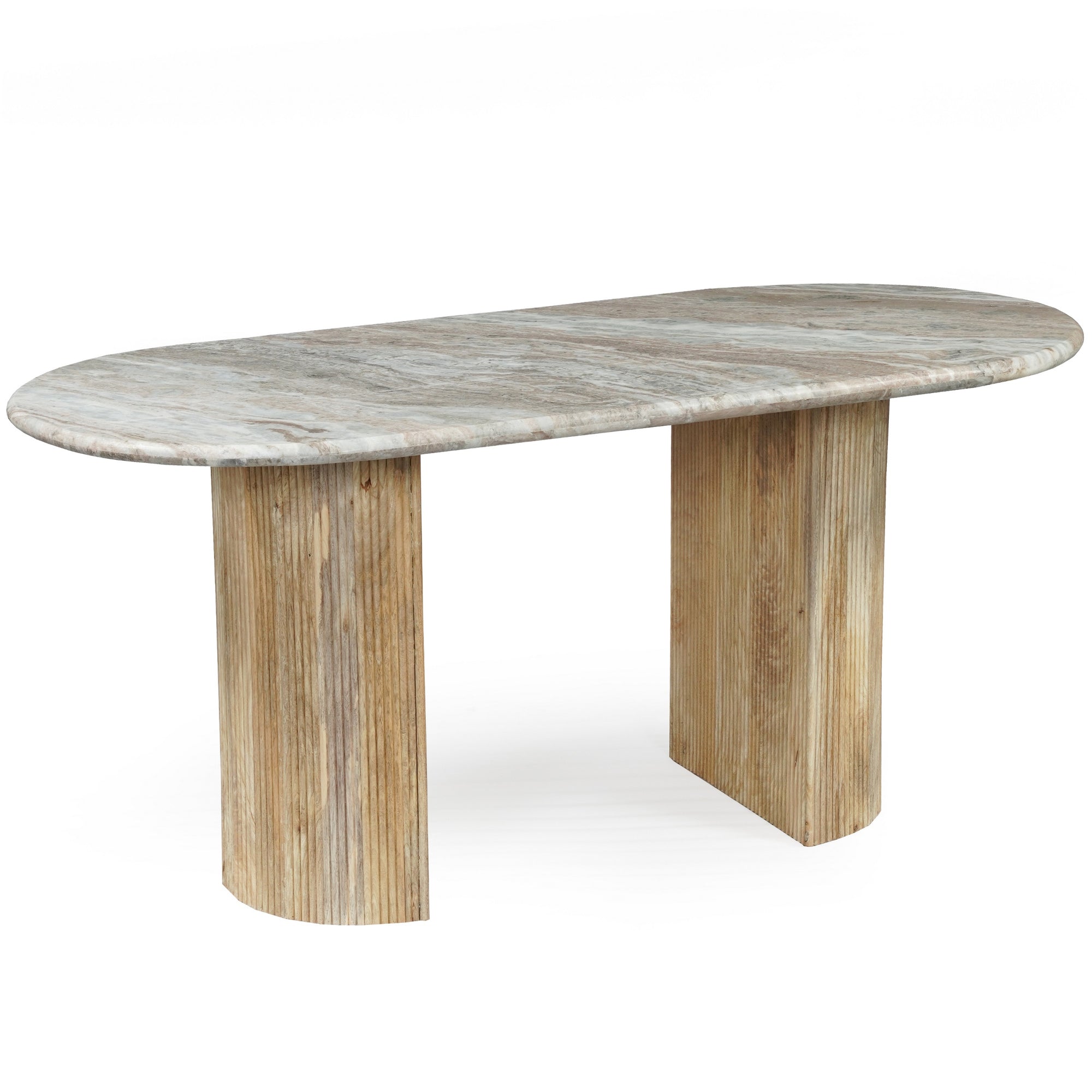 Elevate your dining space with this stunning 6-seater dining table, where timeless luxury meets modern design. The table features a spacious 170cm oval tabletop crafted from beautiful natural white marble, showcasing elegant grey veining that makes each piece unique. The sophisticated top is supported by two distinctive D-shaped pedestal legs. These legs are constructed from wood and feature a contemporary fluted texture, adding visual depth and a touch of refined style. The D-shape of the base not only provides robust stability but also maximizes legroom for comfortable dining. Perfectly balancing natural materials, this table serves as a striking centerpiece for family dinners, gatherings, and stylish entertaining.