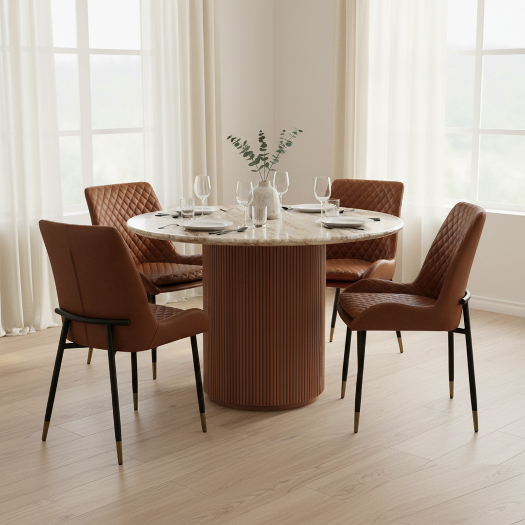 This piece features a spacious 100 cm top crafted from light natural marble, showcasing creamy white, beige, and soft gray veining. The light stone brings a bright, airy feel to any dining area, complementing neutral and organic decor styles beautifully. The table’s luxurious top is anchored by a solid, cylindrical fluted wood pedestal base in a warm, earthy tone. The ribbed texture of the wood base adds a tactile, architectural element, while its medium-toned finish provides a gentle contrast to the luminous marble. Perfect for intimate dinners, this table comfortably seats 2-4 people and serves as a sophisticated focal point.