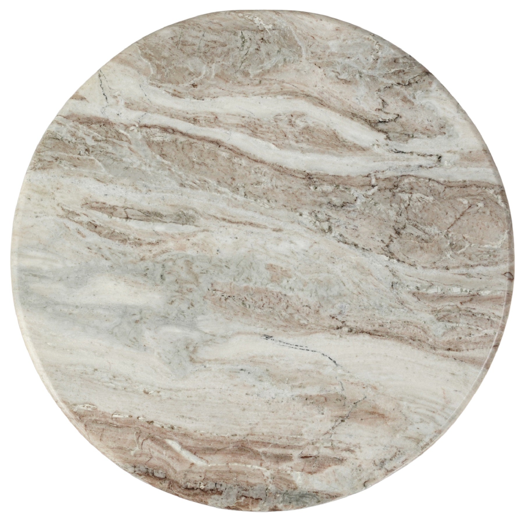 Featuring a striking circular marble surface paired with three elegant wooden pedestal supports, this Ajmer coffee table brings sophisticated style to any living space. Measuring 80x80x40 cm, its compact yet substantial design accommodates beverages and décor while maintaining visual lightness. The natural marble top provides a durable, easy-to-clean surface that develops character over time, while the wooden base offers timeless appeal and structural stability.