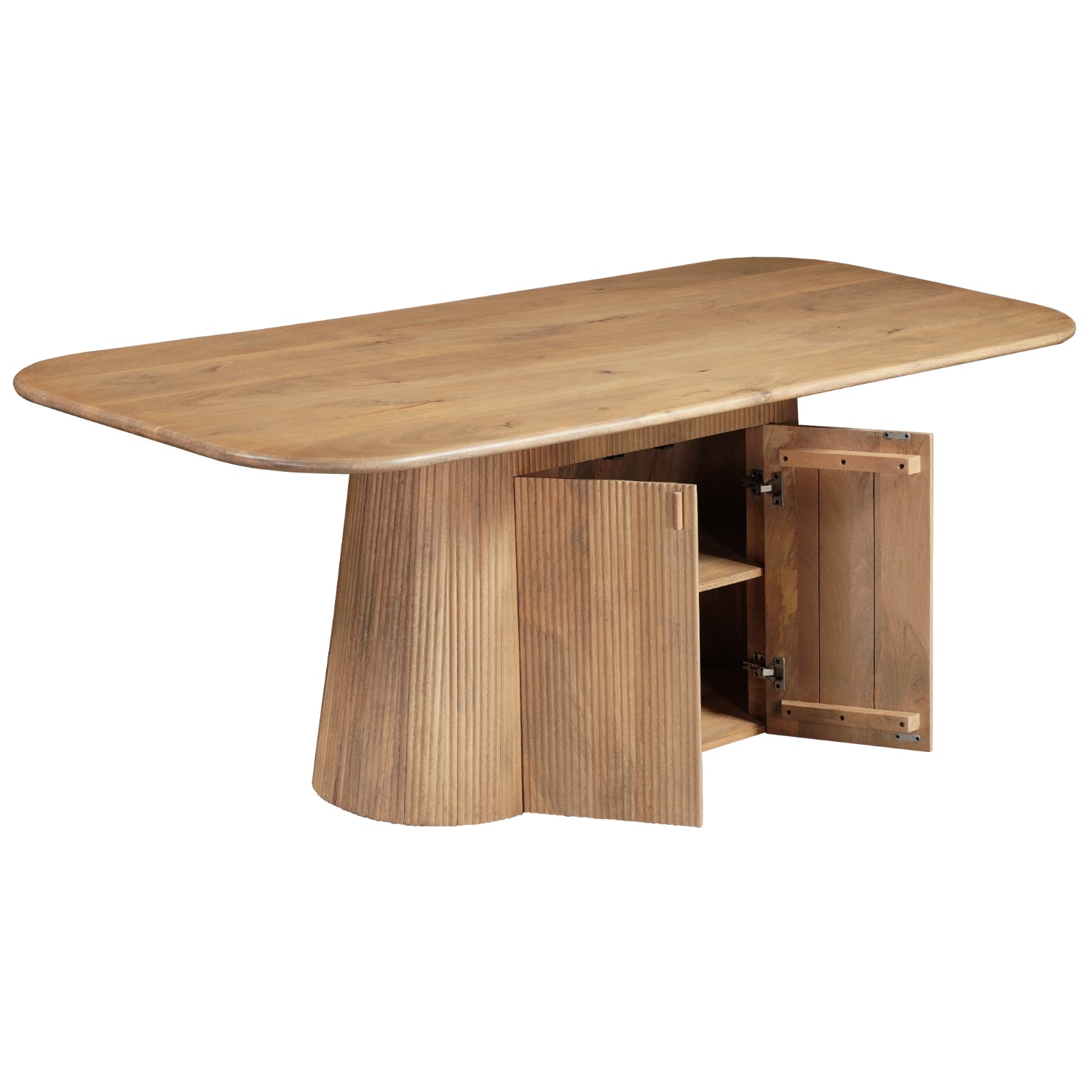 The standout feature is its architectural pedestal base, which is elegantly fluted to create a sense of texture and movement. Cleverly concealed within this ribbed base are two integrated doors that open to reveal a hidden storage cupboard with an internal shelf—ideal for tucking away table linens, placemats, or dinnerware. With its warm natural finish and generous 175x90 cm surface, this table serves as a sophisticated centrepiece for both daily family meals and formal dinner parties.