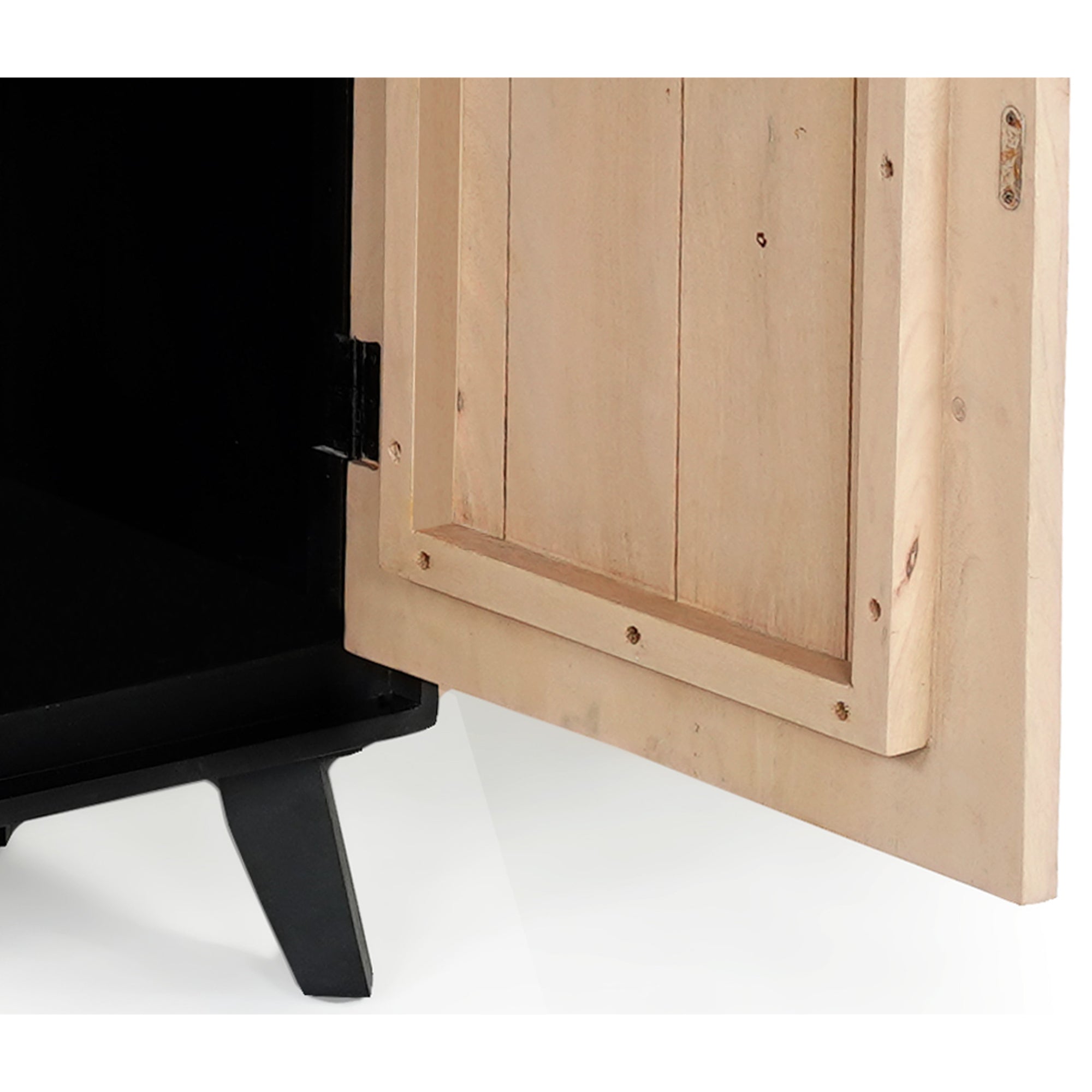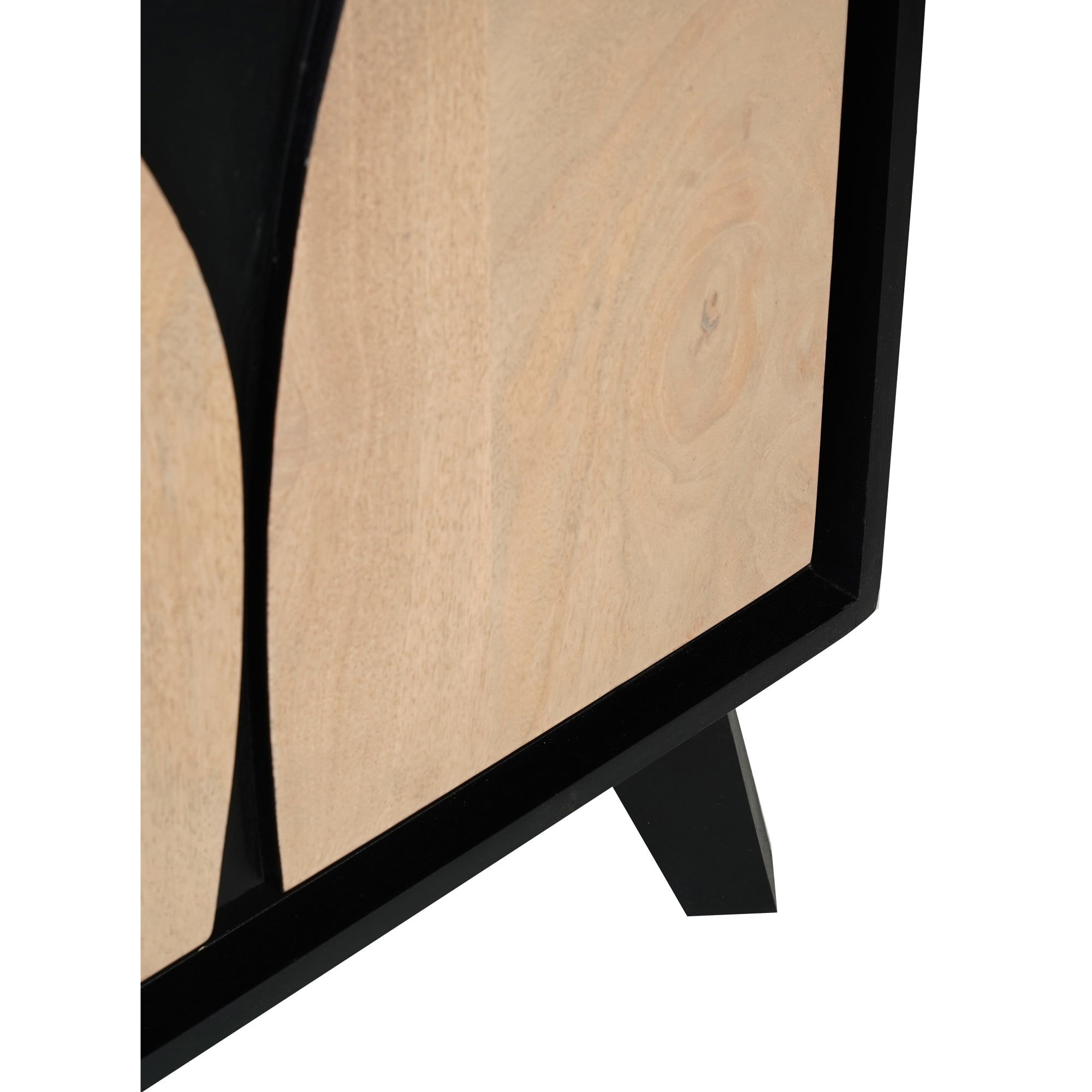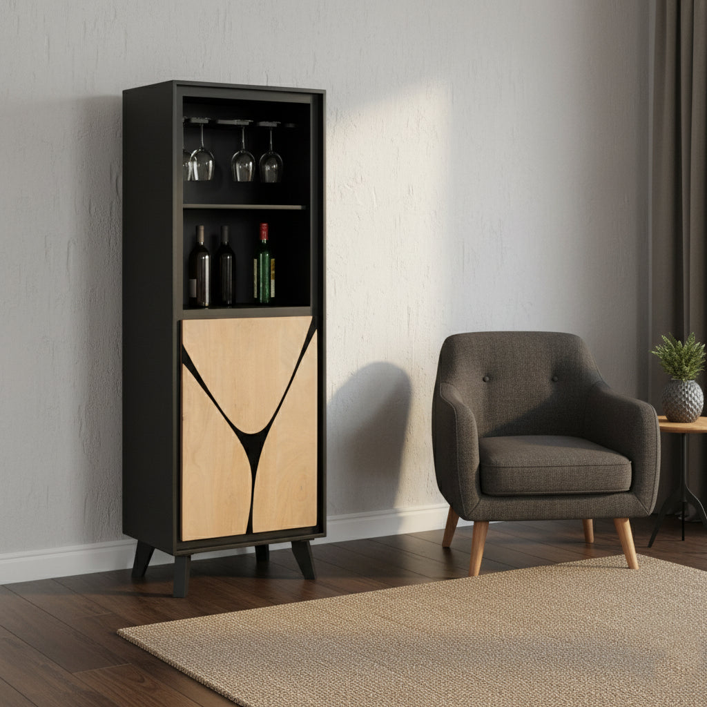 The Dusk Wooden Bookcase with  2 Open Shelf and Door is a striking and versatile piece of furniture that combines artistic design with practical storage. This tall, slender cabinet is crafted from high-quality solid mango wood & engineering wood, featuring a bold black frame that beautifully contrasts with the natural wood grain of the  lower door. The door is adorned with a unique, flowing black abstract inlay, creating a captivating focal point. The top half of the unit features a spacious open shelves for displaying your favourite books or decorative items and hooks for storing wine glasses. Whether used as a sophisticated bookcase, a stylish display cabinet, or a compact drinks cabinet, this piece offers both elegance and functionality. Arriving with only the legs requiring assembly, it’s a hassle-free way to add a statement piece to your living room, dining room, or study.