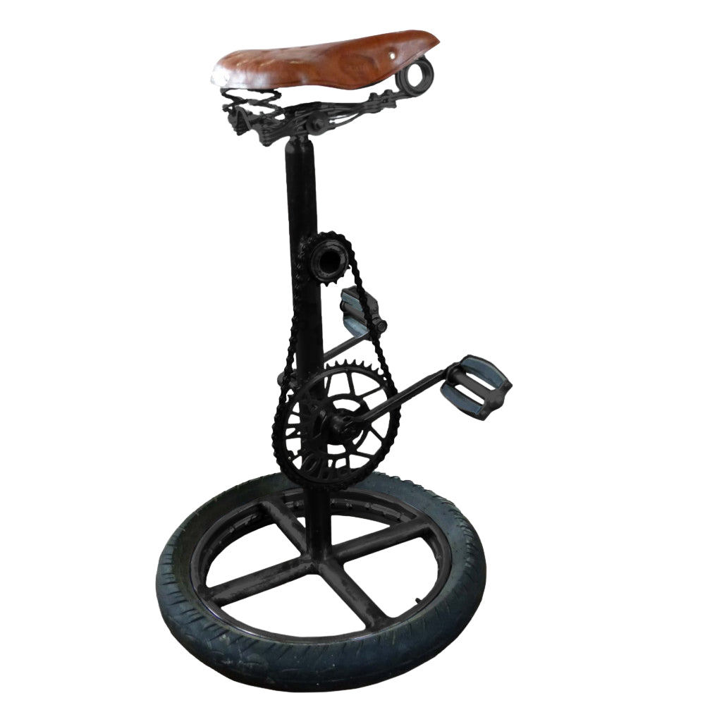 Creative, industrial style stool, made from recycled bicycles, suitable to be used in bars or at home. It will add character to any modern surrounding. Made from reclaimed metal, featuring bike saddle, pedals, wheel and chain.
