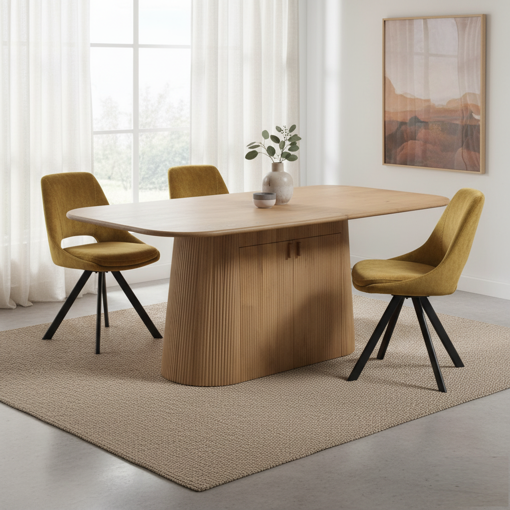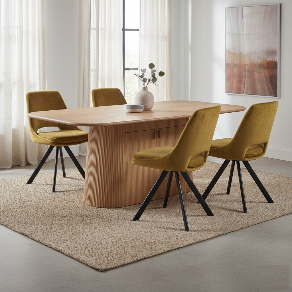 Introduce a vibrant pop of colour and contemporary comfort to your dining space with our swivel dining chairs. Upholstered in a sumptuous, inviting velvet, these chairs offer a luxurious feel and a striking mustard hue that is sure to enliven any room. The sleek, black powder-coated steel legs provide a sturdy and modern base, whilst the 180-degree swivel feature adds a dynamic and functional touch, allowing for effortless movement and conversation.
