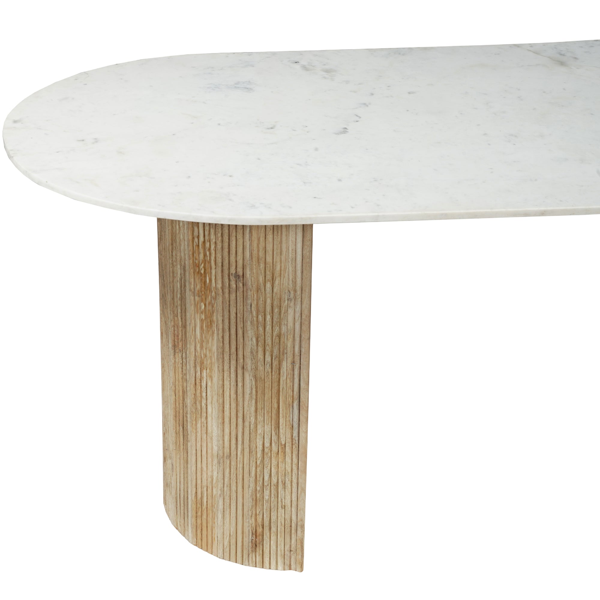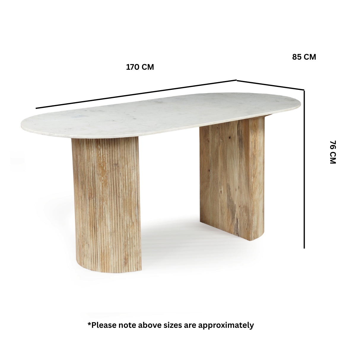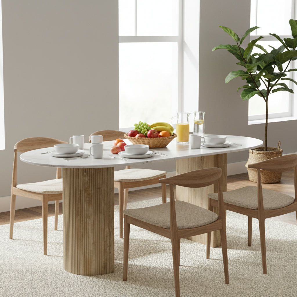 Elevate your dining space with this stunning 6-seater dining table, where timeless luxury meets modern design. The table features a spacious 170cm oval tabletop crafted from beautiful natural white marble, showcasing elegant grey veining that makes each piece unique. The sophisticated top is supported by two distinctive D-shaped pedestal legs. These legs are constructed from wood and feature a contemporary fluted texture, adding visual depth and a touch of refined style. The D-shape of the base not only provides robust stability but also maximizes legroom for comfortable dining. Perfectly balancing natural materials, this table serves as a striking centerpiece for family dinners, gatherings, and stylish entertaining.