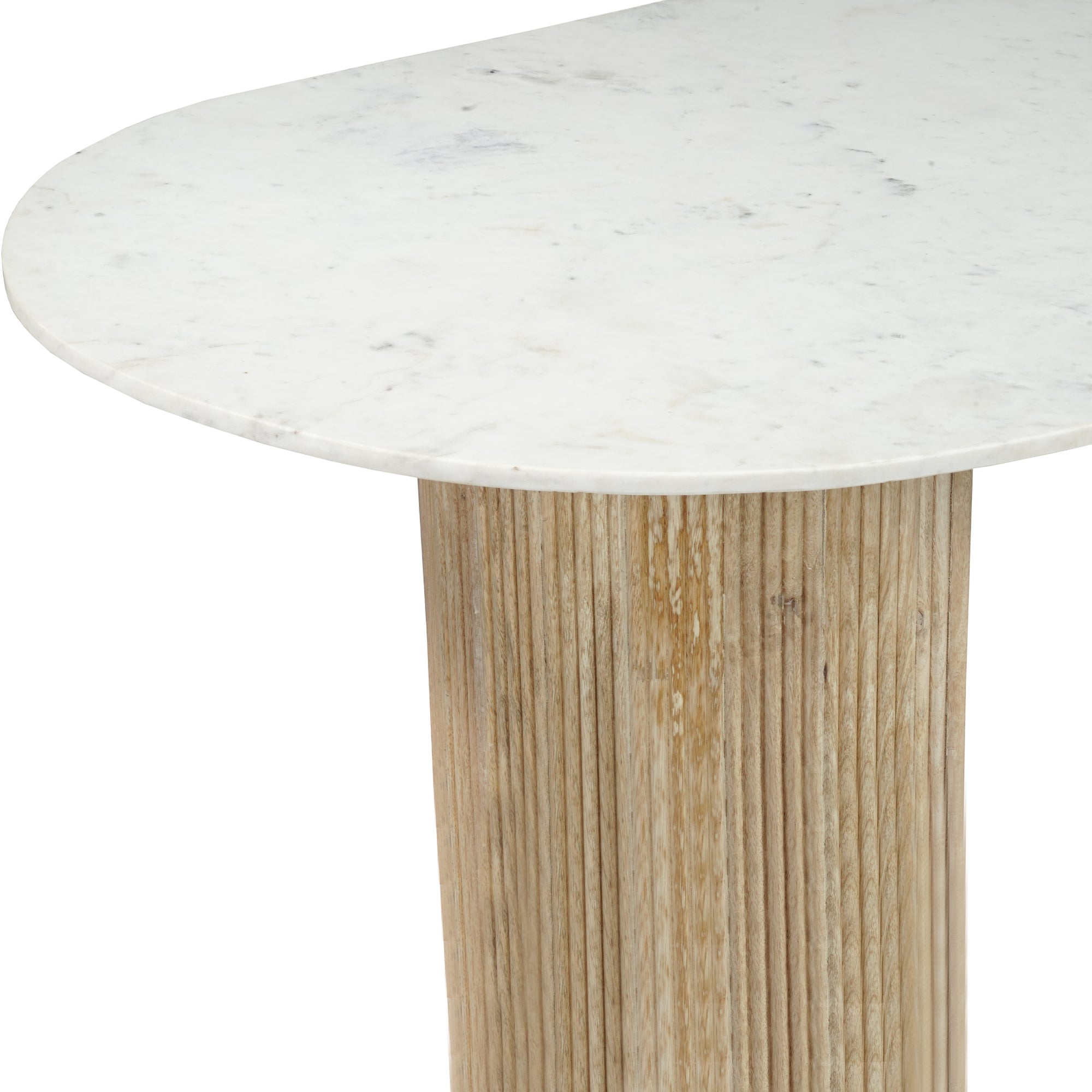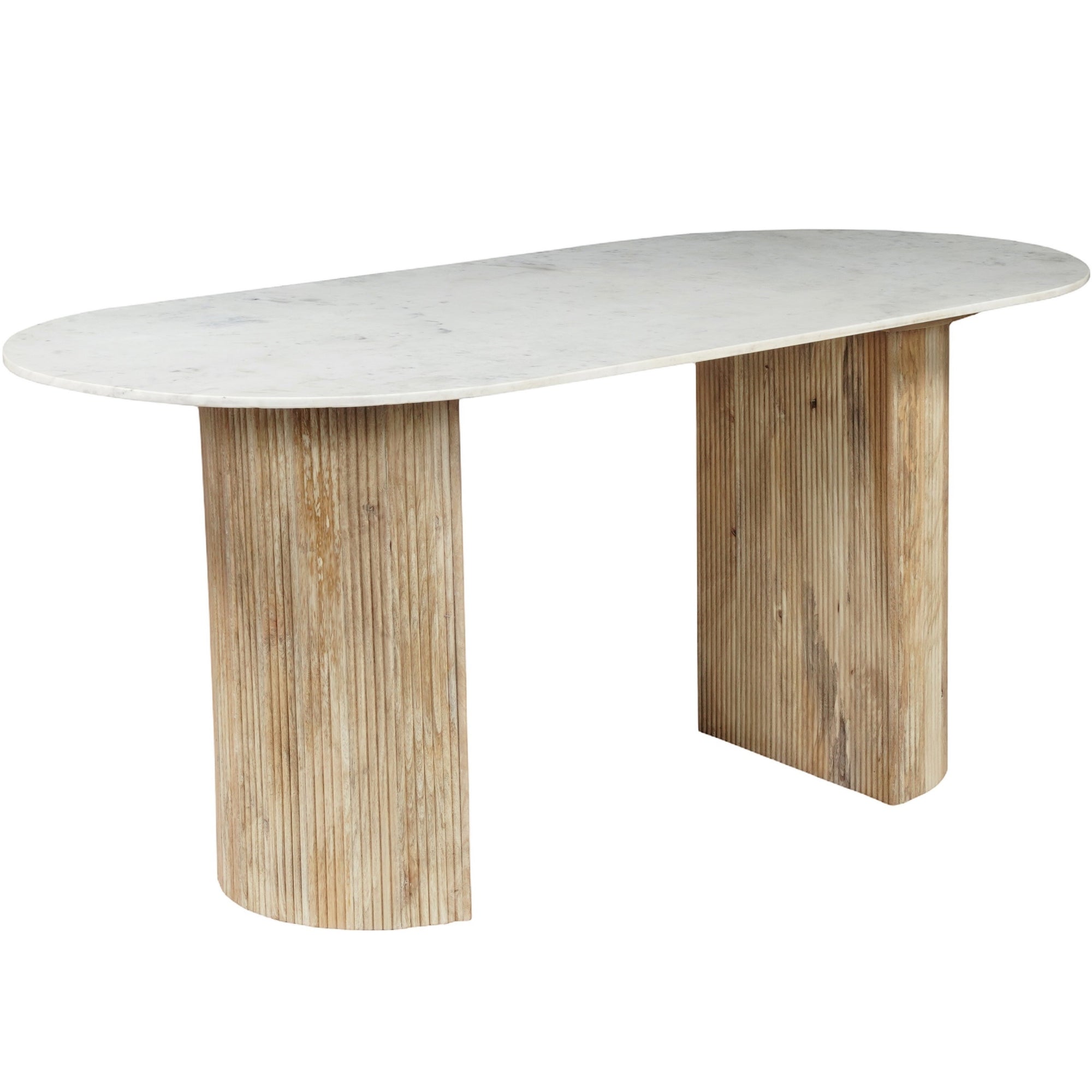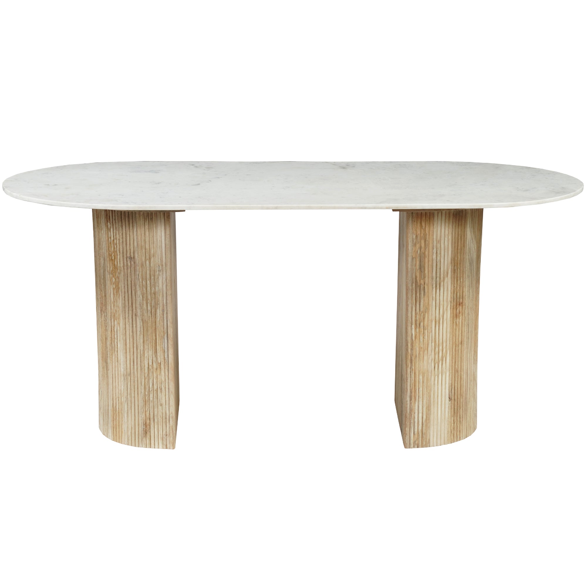 Elevate your dining space with this stunning 6-seater dining table, where timeless luxury meets modern design. The table features a spacious 170cm oval tabletop crafted from beautiful natural white marble, showcasing elegant grey veining that makes each piece unique. The sophisticated top is supported by two distinctive D-shaped pedestal legs. These legs are constructed from wood and feature a contemporary fluted texture, adding visual depth and a touch of refined style. The D-shape of the base not only provides robust stability but also maximizes legroom for comfortable dining. Perfectly balancing natural materials, this table serves as a striking centerpiece for family dinners, gatherings, and stylish entertaining.