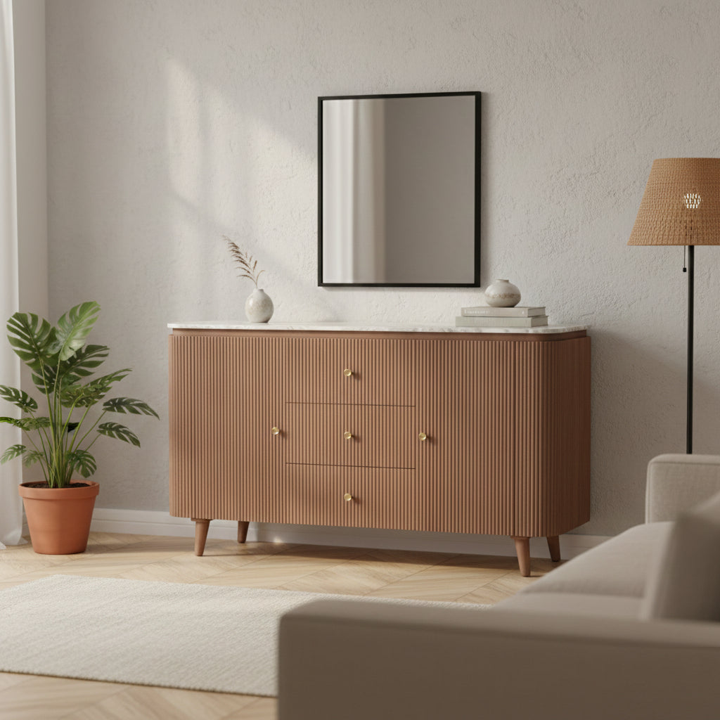 A statement piece that blends natural elegance with modern design. This sideboard boasts a striking combination of a luxurious marble top and a sleek mango wood frame, finished in a pale taupe lacquer for a touch of sophistication. The fluted detailing adds a touch of texture and visual interest.